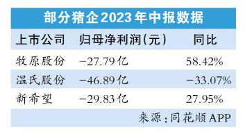 此外,全国规模最大的种猪育种和肉猪养殖上市企业温氏股份的半年报也显示,2023年上半年公司营收为412亿元,同比增长30.61%;归母净利润亏损达46.89亿元,利润同比下滑超33%。