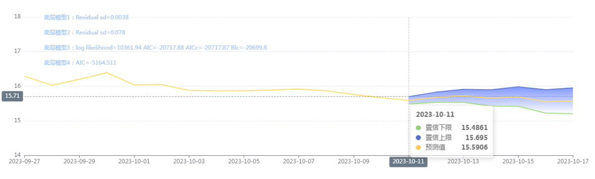 玄田算法是由项目课题组团队原创的非经典逻辑数值聚合理论和不确定性预测方法,构建了基于一致模算子的生猪价格预测模型。该模型采用的聚合函数及一致模相关理论与方法已获得多项国家自然科学基金和省级自然科学资金资助,并获得多项省级自然科学奖奖项。10月11日预测猪价为15.5906,置信区间在15.4861--15.695之间。10月12日预测猪价为15.6811;10月13日预测猪价为15.7211。