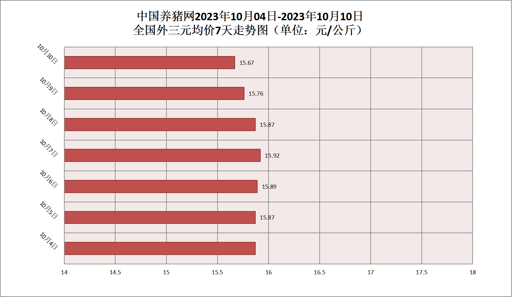 2023年10月10日(星期二),据中国养猪网猪价系统监测,全国外三元均价为15.67元/公斤,猪价较昨日15.76元/公斤)下跌了0.09元/公斤,较上月(15.69元/公斤)下跌了0.02元/公斤。
