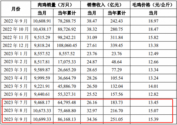 光大证券近期研报认为,由于终端需求疲弱,相较于往年双节备货旺季,今年9月肉鸡遭遇旺季不旺行情。9月份,温氏股份肉鸡的销售量和收入均实现小幅的环比增长,但同比的下降幅度较大,尤其是在收入和毛鸡销售均价上,分别下降了10.68%和18.87%。