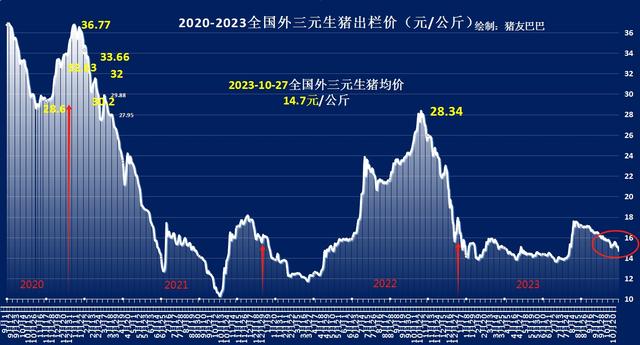 因此,受阶段性生猪供应集中,需求缺乏实际利好,二育以及屠企分割入库情绪谨慎,猪价呈现“断崖下跌”的走势,据机构数据分析,10月27日,全国标准体重外三元生猪价格出栏均价在14.7元/公斤,猪价下跌0.28元,月内猪价下挫7.5%,相比8月初的高点跌幅达到了16.33%!