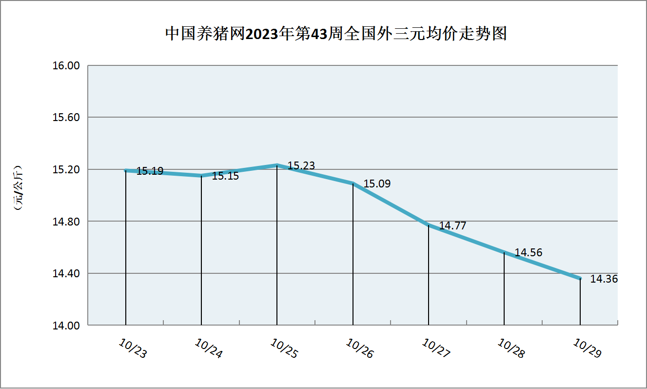 据中国养猪网猪价系统数据监测,2023年第43周(2023年10月23日至2023年10月29日)全国外三元生猪价格整体呈现涨跌调整行情,周初波动幅度较为平稳,出现小幅回温,周中和周末大幅走跌,区间在14.36-15.23元/公斤之间!周初猪价为15.19元/公斤,周末猪价为14.36元/公斤,全周猪价累计下跌了0.83元/公斤。