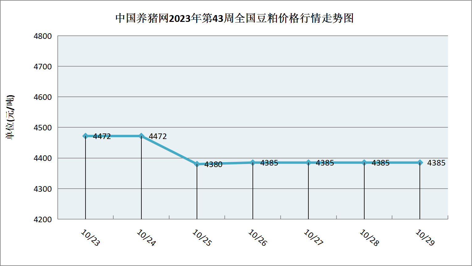 据中国养猪网猪价系统数据监测,2023年第43周(2023年10月23日至2023年10月29日)本周豆粕价格周初出现小幅走跌,周中至周末走势平稳,全周豆粕价格区间在4380-4472元/吨之间,周初豆粕价格为4472元/吨,周末价格为4385元/吨,全周豆粕价格累计下跌了87元/吨。
