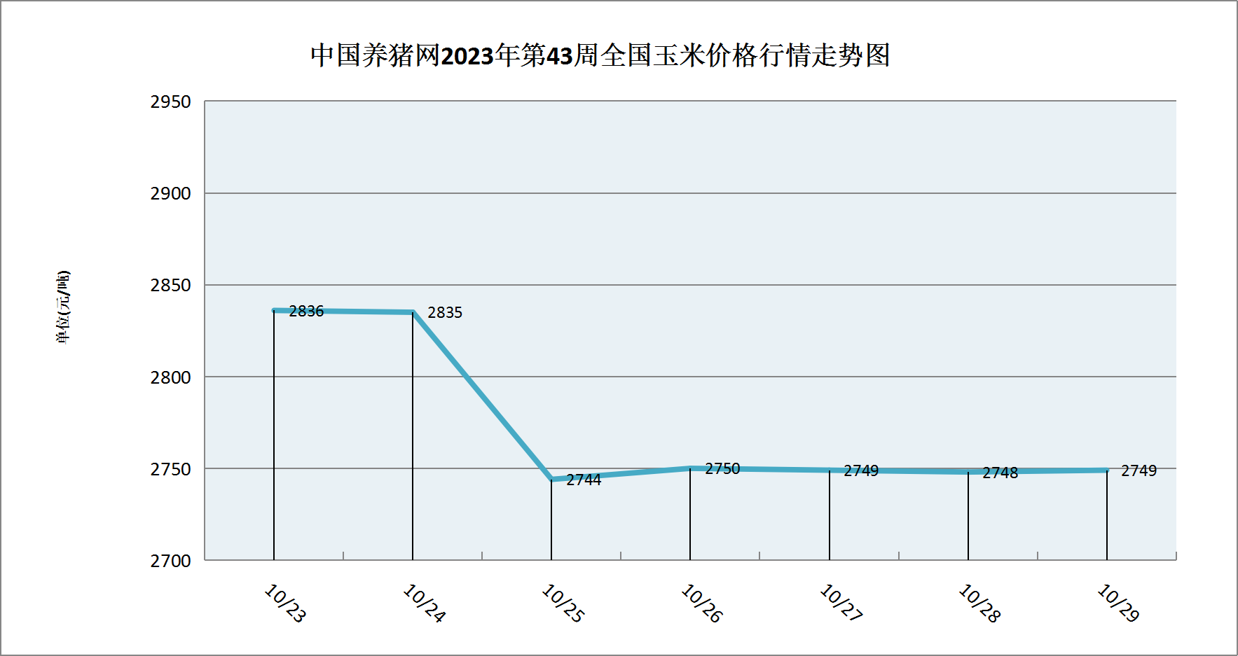 据中国养猪网猪价系统数据监测,2023年第43周(2023年10月23日至2023年10月29日)本周我国玉米价格周初波动不大,周初出现大幅走跌,周中至周末期较为平稳,全周玉米价格区间在2770-2836元/吨,周初期玉米价格为2744元/吨,周末期价格为2836元/吨,全周玉米价格累计下跌了92元/吨。