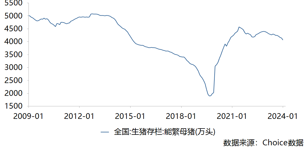 根据农业农村部监测,2024年1月全国能繁母猪存栏量4067万头,比上个月减少75万头,环比下降1.8%,连续4个月环比下降;同比下降6.9%,连续7个月同比减少,而这也是自2021年以来最少存栏量,3年最低。