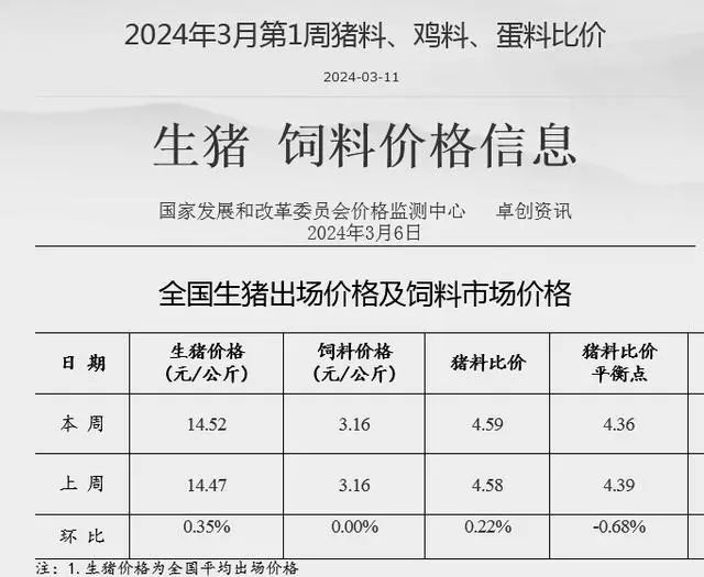 国家发展和改革委员会价格监测中心和卓创资讯于3月6日联合发布的《2024年3月第1周猪料、鸡料、蛋料比价》显示,本周全国猪料比价为4.59,环比上涨0.22%。按目前价格及成本推算,未来仔猪育肥模式的生猪养殖头均盈利为79.95元。
