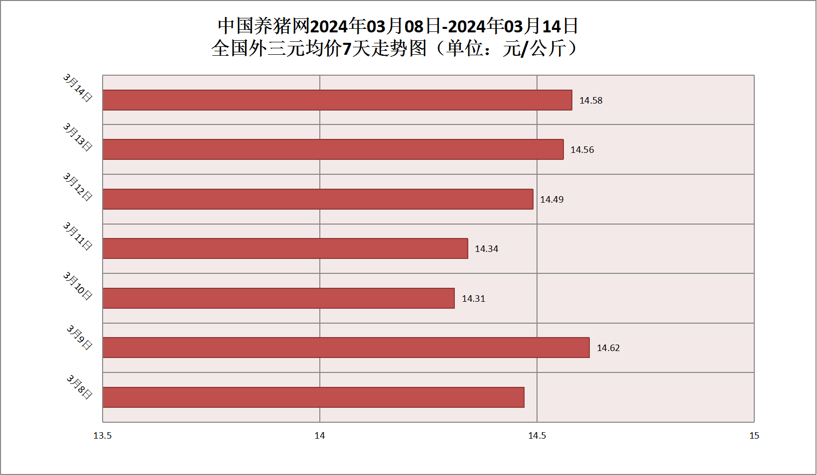 2024年03月14日(星期四),据中国养猪网猪价系统监测,全国外三元均价为14.58元/公斤,猪价较昨日(14.56元/公斤)上涨了0.02元/公斤,较上月(16.02元/公斤)下跌了1.44元/公斤。