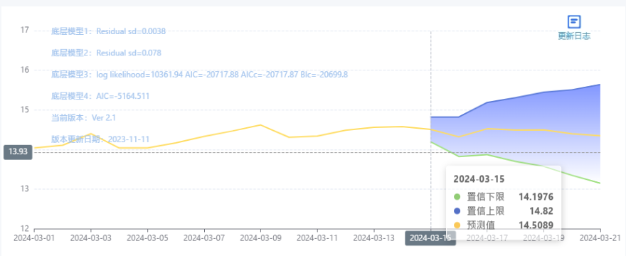 玄田算法是由项目课题组团队原创的非经典逻辑数值聚合理论和不确定性预测方法,构建了基于一致模算子的生猪价格预测模型。该模型采用的聚合函数及一致模相关理论与方法已获得多项国家自然科学基金和省级自然科学资金资助,并获得多项省级自然科学奖奖项。03月15日预测猪价为14.5089,置信区间在14.1976--14.82之间。03月16日预测猪价为14.3207;03月17日预测猪价为14.5255。