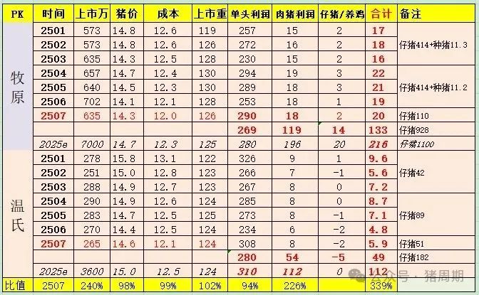 7月份牧原上市量比温氏多1.3倍,猪价和成本都是温氏的98%左右,上市重高2%,单头毛利低3%,肉猪利润高1.2倍,牧原939万仔猪利润12亿,温氏182万仔猪利润2亿,温氏养鸡亏7亿,最后牧原利润是温氏的2.4倍。