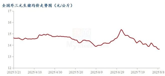 截至8月8日,全国外三元生猪出栏均价跌至13.64元/公斤,较7月初阶段性高点(15.37元/公斤)跌幅达11.2%,连续20天呈现“涨少跌多”的偏弱震荡态势。此轮价格下行的核心矛盾在于阶段性供大于求:养殖端因夏季料比高、成本压力大而集中出栏,规模企业降重出栏,与散户前期压栏猪源集中释放形成叠加效应;需求端则受高温淡季制约,白条走货量减少屠宰企业开工率降至“冰点”,日均宰量下降,持续亏损下进一步抑制采购积极性。