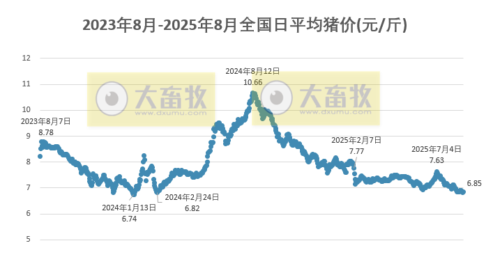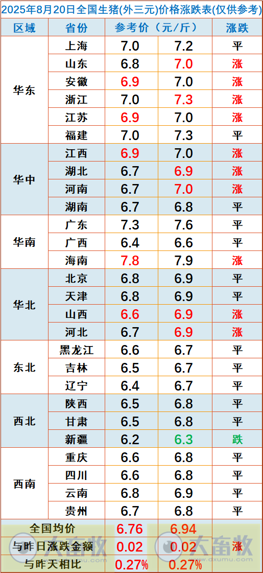 大畜牧根据27省的猪价数据,计算出8月20日全国平均猪价为每斤6.85元,比昨天上涨0.02元,涨幅为0.27%,止跌上涨,且结束连续4天的下跌;