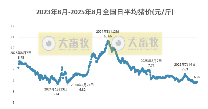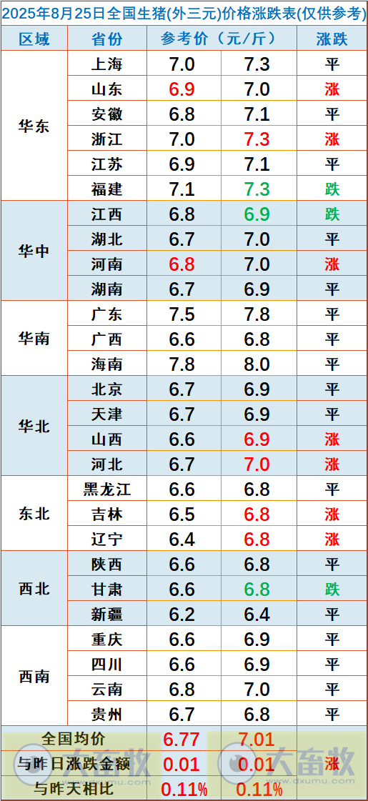 大畜牧根据27省的猪价数据,计算出8月25日全国平均猪价为每斤6.89元,比昨天上涨0.01元,涨幅为0.11%,连续2天上涨,累计上涨0.03元,为近4天最高价;