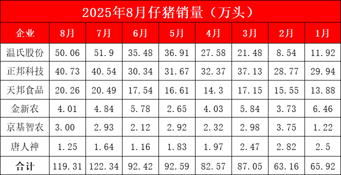 首先,首先价格跌至成本线之后,集团企业会减少仔猪外销量,栏位不紧张的情况下,多数会选择自主投苗。比如8月份,6家上市猪企销售仔猪119.31万头,比7月减少了3万头,预计9月份将继续减少。