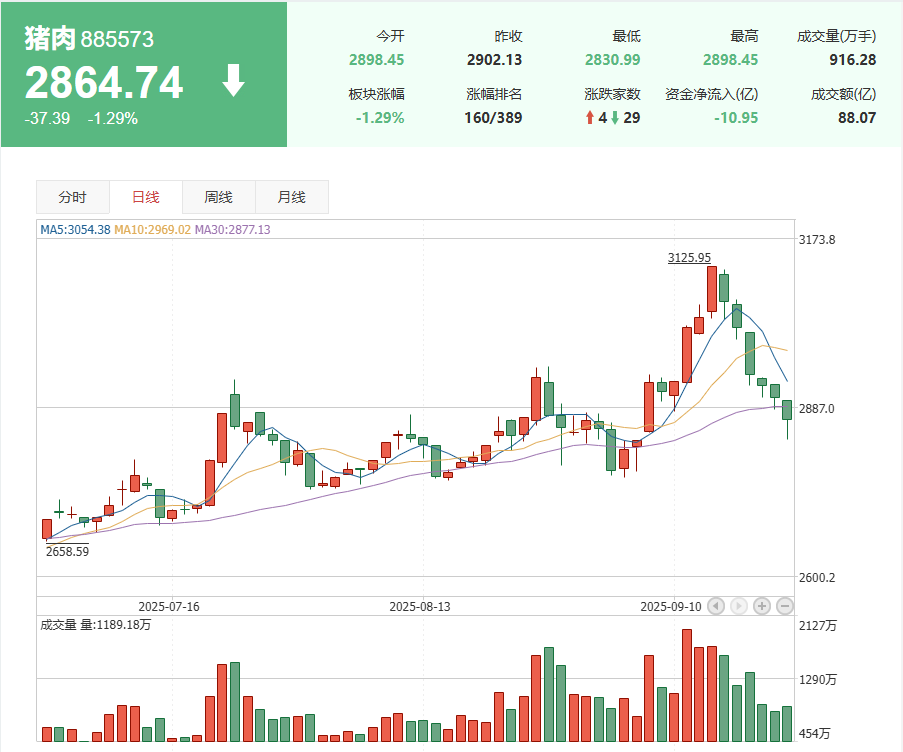 下跌的还有此前不断上涨的猪肉股价,从9月16日开始,猪肉概念指数从3125.95跌至2864.74,跌幅达到8.36%。