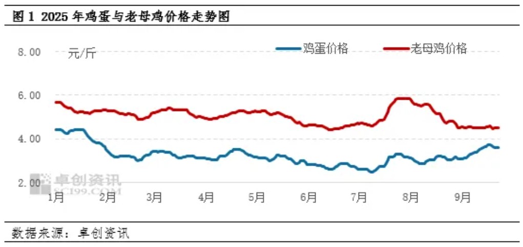 在农产品市场中,老母鸡价格与鸡蛋价格长期以来呈现高度的正相关关系,而两者的价格联动源于其共同的产业基础,在蛋鸡养殖行业中,老母鸡既是鸡蛋的生产者,本身也是肉食产品的重要来源,当鸡蛋价格上涨时,养殖企业倾向于延长蛋鸡的产蛋周期,减少老母鸡的出栏量,导致老母鸡供应收缩,从而推高其价格;反之,鸡蛋价格下跌时,养殖企业会加速淘汰老母鸡,市场供应增加,进而压制其价格。根据近三年及今年的1-8月份两者的价格波动数据研究发现,老母鸡价格与鸡蛋价格的相关系数也在0.5以上,表明鸡蛋价格的波动往往会传导至老母鸡的价格。然而9月这一传统关联被打破。据卓创资讯监测数据显示,9月鸡蛋价格从月初的3.10元/斤涨至22日的3.62元/斤,涨幅16.77%,期内最大涨幅20.97%。而老母鸡价格却异常稳定,期内价格维持在4.48-4.58元/斤,最大波动幅度仅为2.23%,两者的相关系数骤降至0.04。这一价格波动的背后,是短期市场供需结构的变化对长期规律的打破。