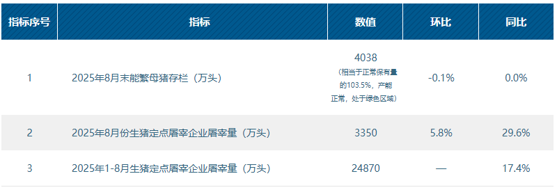 产能过剩是当前养猪业面临的核心问题。农业农村部数据显示,8月末全国能繁母猪存栏量4038万头,为3900万头正常保有量的103.5%,较7月末下降4万头,环比-0.1%。