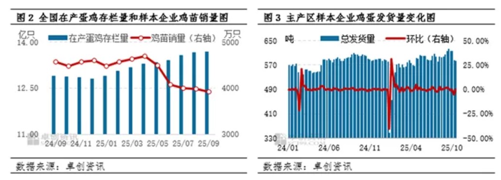 需求低位稍增,供应面压力仍在,鸡蛋价格或低位盘整。需求低位稍增:食品加工企业需求难有起色,但电商促销或带动需求小幅回暖。供应预期高位微增:根据前期鸡苗销量以及老母鸡出栏量数据进行推算,11月新开产蛋鸡供应量或有所减少,但养殖户惜售情绪影响下,老母鸡淘汰量可能减少,或支撑在产蛋鸡存栏量高位微增,鸡蛋供应仍较充足。11月鸡蛋市场供需双增,蛋价或低位趋稳,预计在3.00-3.10元/斤,蛋价难有明显上涨。