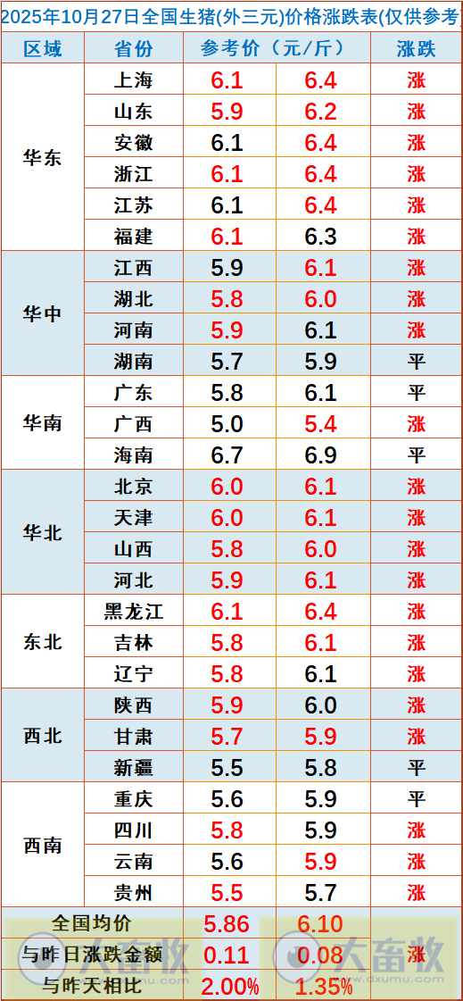 大畜牧根据27省的猪价数据,计算出10月27日全国平均猪价为每斤5.98元,比昨天上涨0.10元,涨幅为1.68%,又出现大涨了,且涨至21天最高价。