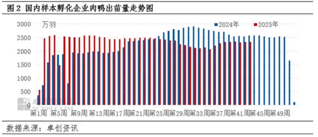 肉鸭市场的价格波动主要是受供需面影响。供应方面,11月出栏毛鸭主要对应补栏时间段在9月末及10月中上旬。根据卓创资讯监测数据显示,此时间段内样本孵化企业出苗量为9374万羽,环比增幅5.40%。前期鸭苗孵化虽亏损,但根据产能传导周期来看,新开产父母代种鸭数量较多,在产父母代种鸭存栏量环比提升,使得孵化场出苗量增加。11月所对应鸭苗供应虽有所增加,但伴随降温影响,肉鸭养殖难度或有所提升,大规格毛鸭出栏或稍降,预计11月鸭产品供应增幅或较10月下滑。