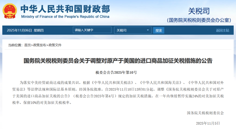 11月5日,国务院关税税则委员会发布2025年第9号及第10号公告,对原产于美国的进口商品加征关税措施作出调整。