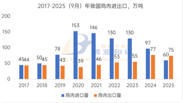2017-2025(9月)年我国鸡肉进出口变化
