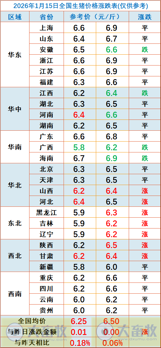 大畜牧根据27省的猪价数据,计算出2026年1月15日全国平均猪价为每斤6.38元,比昨天上涨0.01元,涨幅为0.12%,涨幅收窄,连续6天上涨,累计上涨0.10元,为近13天最高价。
