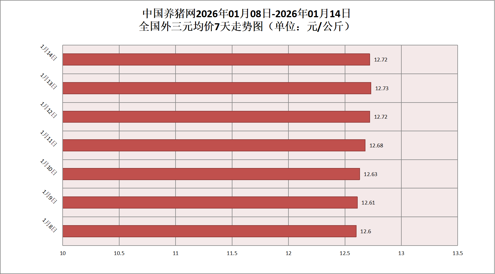 2026年01月14日(星期二),据中国养猪网猪价系统监测,全国外三元均价为12.72元/公斤,猪价较昨日(12.73元/公斤)下跌0.01元/公斤,较上月(11.56元/公斤)上涨了1.16元/公斤。