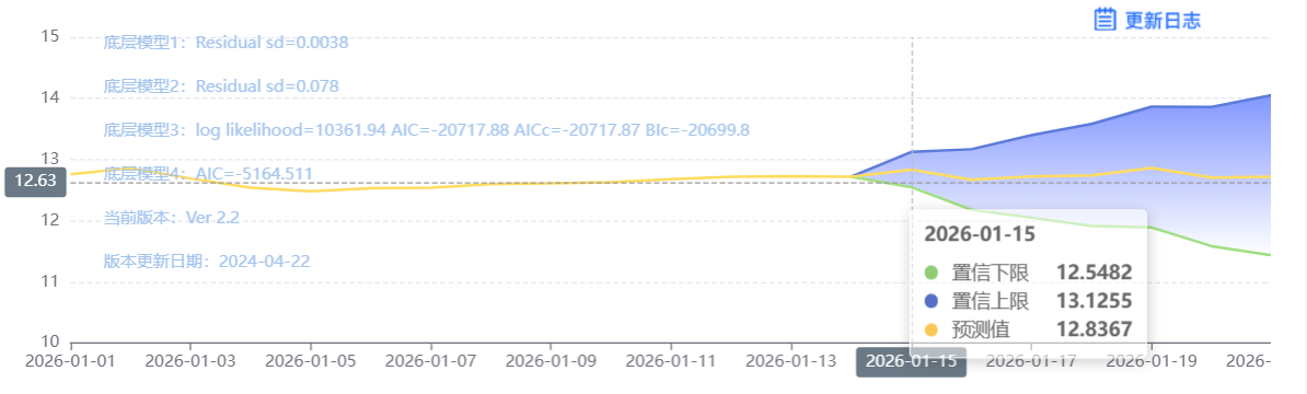 玄田算法是由项目课题组团队原创的非经典逻辑数值聚合理论和不确定性预测方法,构建了基于一致模算子的生猪价格预测模型。该模型采用的聚合函数及一致模相关理论与方法已获得多项国家自然科学基金和省级自然科学资金资助,并获得多项省级自然科学奖奖项。01月15日预测猪价为12.7305,置信区间在12.2414--13.2327之间。01月16日预测猪价为12.7103;01月17日预测猪价为12.7681。