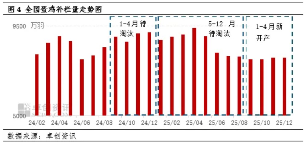 结合补栏量、出栏量、出栏日龄及上月存栏基数等核心指标,可推断出2026年1-4月理论在产蛋鸡存栏量。以2025年12月13.44亿只存栏为基数,参考490天的淘汰日龄,1-4月新开产蛋鸡为25年9-12月补栏鸡苗,理论待淘汰蛋鸡为24年9-12月补栏鸡苗,由此判断理论上4月存栏量将降至13.01亿只,整体呈稳步去产能态势。