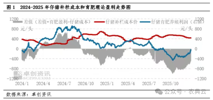 考虑近两年饲料成本呈下滑趋势,但相较仔猪成本环比调整幅度有限,对短育肥周期成本影响幅度微弱。因此,重点从仔猪补栏成本和育肥盈利差值来看,2025年两者走势形成明显剪刀差,差值均值为-438.38元/头,其差值总体为负。核心原因在于2025年仔猪补栏年均成本为435.50元/头,多时段维持高位,仔猪采购成本对育肥盈利产生较大制约。因此,7月中旬以后,育肥盈利在前期补栏仔猪成本抬升、肥猪销价走低过程中,两者差值逐步走阔,育肥盈利也逐步收窄,甚至陷入持续亏损。以上分析反映出在仔猪育肥模式下,前期较高的仔猪补栏成本往往使得后期育肥盈利陷入困境。
