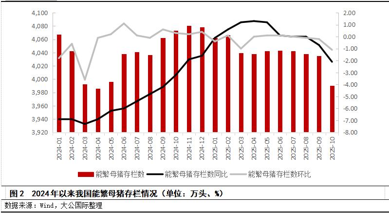 生猪养殖行业预计2026年上半年仍将存在一定供应压力,下半年产能去化的效果显现后,市场供给有望下行。根据国家统计局数据,2025年全年生猪出栏71,973万头,增长2.4%;年末生猪存栏42,967万头,增长0.5%,猪肉产量5,938万吨,增长4.1%。根据农业农村部数据,2025年上半年,能繁母猪产能整体规模变化有限,处于相对高位;2025年8月以来,在政策引导下,产能逐步去化,加之市场价格不及预期,行业亏损带动能繁母猪存栏数连续环比下降。2025年10月末,能繁母猪存栏3,990万头,为2024年6月以来首次重回4,000万头以下。截至2025年四季度末能繁母猪存栏3,961万头(相当于正常保有量的101.6%,产能正常,处于绿色区域),环比下降1.8%,同比下降2.9%。