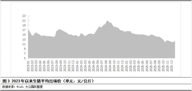 受供给压力影响,2025年全年生猪出场价格整体呈现下行趋势,2025年年末以来至2026年年初,生猪价格小幅回升,但仍处于相对低位。2025年1月,市场价格受节日需求刺激等有所支撑,节后开启传统消费淡季,价格下行,上半年虽有个别短期价格波动,但整体震荡回落;年中至三季度,受供给增加和高温天气抑制消费等因素影响,价格短暂反弹后再度探底;四季度是猪肉传统消费旺季,但需求对市场的提振力度有限,生猪价格处于低位震荡区间。