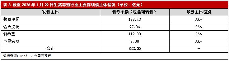 截至2025年末,农林牧渔行业存续债券144只,债券余额1,220.15亿元,其中生猪养殖行业存续债项主要集中在牧原股份、温氏股份、新希望和巨星农牧。按存续债类型分,主要是中期票据、超短期融资券、定向工具和可转债。截至2026年1月29日,按到期日分,2026年内到期债券规模14.40亿元、2027年到期债券规模273.93亿元、2028年到期债券规模19.00亿元、2029年到期债券规模15.00亿元。存续债券中,除可转换公司债券外,其他债项整体规模不大。