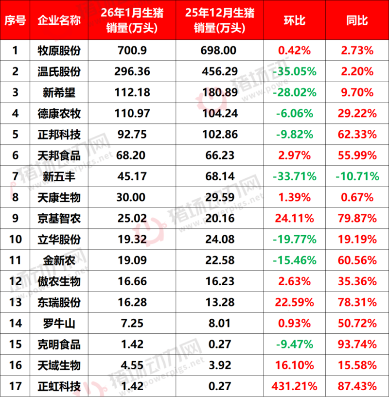 近期,各家上市猪企陆续公布了2026年1月份的销售简报,截至2月11日,猪场动力网整理统计了17家上市猪企的数据,通过对出栏量、销售均价、销售收入三个主要方面进行了数据分析,发现17家企业出栏量环比上呈现整体下跌、但同比九成以上都保持增长;而销售均价方面,全部都实现了环比增长。不过均价比起25年同比大降3元左右。按照数据估算,有近三成猪企月度预亏损。