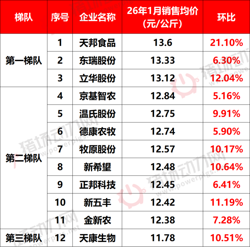 具体来看,1月销售均价可以分为3个梯队,第一梯队为13元/公斤以上,有天邦食品、东瑞股份、立华股份3家企业。其中,天邦环比上涨幅度最大超过20%,因此也跻身均价榜单第一名。