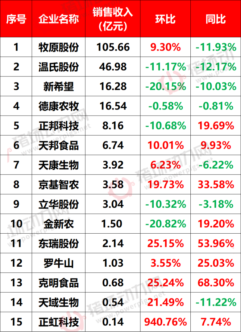 其中,牧原以105.6亿元排名收入榜首。销售收入环比同比双双下降的有温氏股份、新希望、德康农牧、立华股份4家企业;而双增的则有天邦食品、京基智农、东瑞股份、罗牛山、克明食品、正虹科技6家企业。尤其是正虹科技,销售收入激增940.76%,企业表示主要是由于出栏量增长所致。