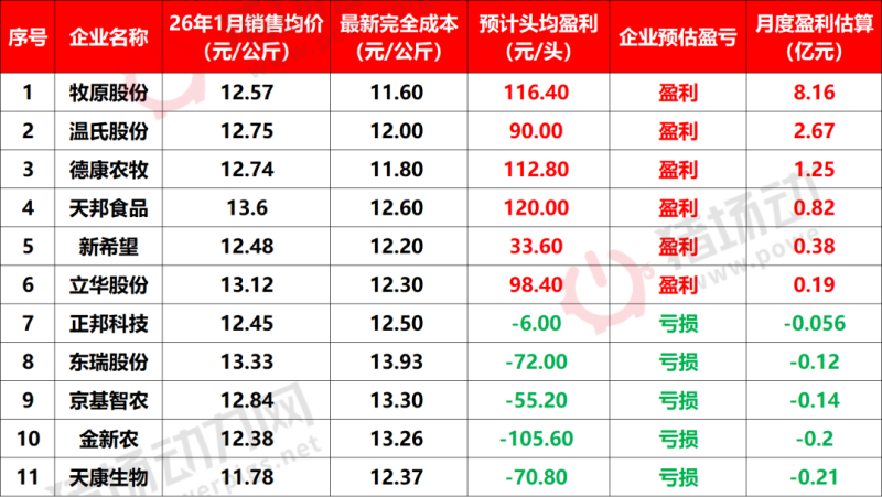 盈利(估算)企业分别是牧原股份、温氏股份、新希望、德康农牧、天邦食品、立华股份,其中也只有牧原1家企业盈利最多超过8亿元,其他的预盈利约0.19-2.67亿元不等。