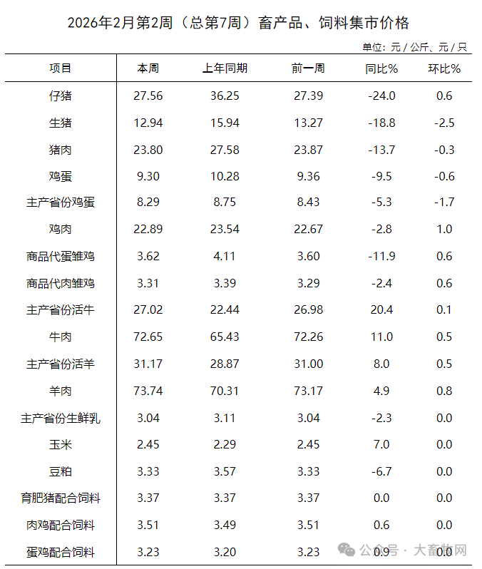 农业农村部发布2026年2月第2周畜禽产品和饲料集贸市场价格情况