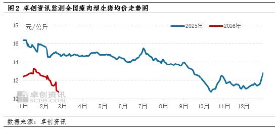 从供需基本面来看,春节后居民家庭库存肉充足,餐饮、团体消费恢复缓慢,终端需求进入传统淡季;而养殖端适重猪源供应充足,市场供应压力不减,供需失衡进一步压制猪价,成为猪价下跌的核心推手。截至25日,卓创资讯监测2月份全国瘦肉型生猪均价为11.68元/公斤,月内价格加速走低,25日全国瘦肉型生猪均价更是跌至10.74元/公斤,创下阶段性新低。猪价持续下行,使得生猪销售收入大幅减少,而养殖端饲料等成本相对刚性,自繁自养与仔猪育肥盈利同步减少,亏损幅度加深。