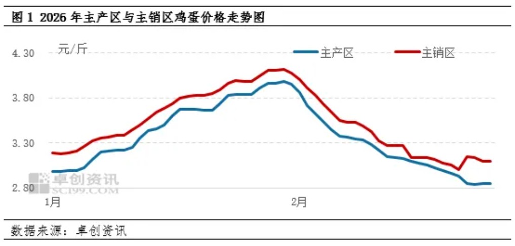 与需求疲软形成对比的是供应端的阶段性压力释放。春节假期期间,养殖端正常生产,而物流运输和终端销售放缓,导致产区库存有所积压,部分地区库存最多增至3-4天。节后开市,养殖户和贸易商面临去库存压力,出货意愿较强,供需错配下价格承压下行。根据卓创资讯监测数据显示,节后主产区鸡蛋均价开盘即跌至2.85元/斤,较节前下跌超过13%。