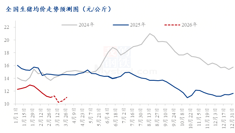 综合来看,3月价格重心或下移,不乏出现阶段性低点可能。主流价格区间或维持10.2-11.4元/公斤的水平。生猪市场供应或增加,需求端或减少,因此供大于求背景下,均价水平或低于2月份,重心下移。