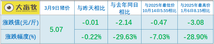 大畜牧小编根据我国27省的猪价数据,计算出2026年3月9日全国平均猪价为每斤5.07元,比昨天下跌0.02元,跌幅为0.22%,不仅是今年以来最低价,也是连续2天创下2019年以来最低;