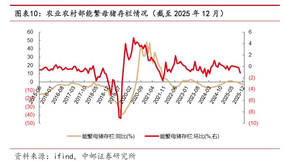 数据显示,2025年中国能繁母猪月均存栏量为4,032万头,高于正常保有量3,900万头。从市场机构公布的预估数据来看,当前全国能繁母猪存栏量仍在3960万头左右,仍高于正常保有量,意味着今年上半年国内生猪供应仍然较为宽松。