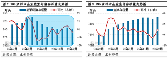 根据卓创资讯监测的196家中大型样本企业存出栏数据显示,2025年能繁母猪存栏量呈先增后减再盘整态势,2026年3-12月份生猪理论出栏量对应2025年5月份-2026年2月份的能繁母猪存栏量,2025年5-6月份能繁母猪存栏量增加,7-9月份回落,此后跌势暂止,对应2026年3-4月份生猪理论出栏量增加、5-7月份理论出栏量减少、此后主线稳定。2026年2月份样本企业能繁母猪存栏量与2025年6月份高点相比仅下滑3.95%,仍未触及去产能的目标。