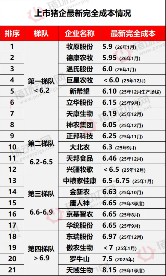 3月11日,在猪场动力网最新统计出炉的数据中,21家上市猪企,超过一半的企业养猪成本已经压到了6.5元/斤以下,更有牧原股份和德康农牧两家率先杀入“5元时代”。以当前出栏猪价来算,全行业已经陷入亏损黑洞,无人幸免。