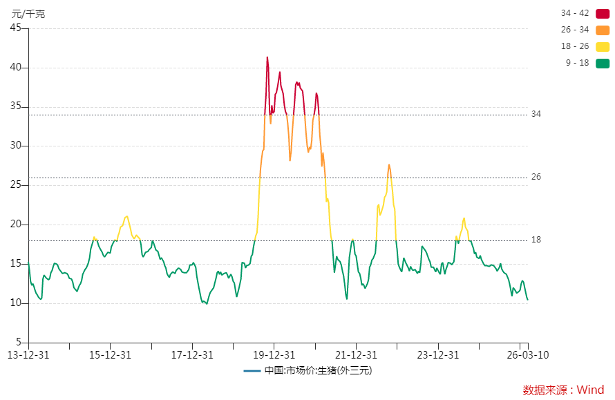 国家统计局数据显示,今年3月上旬,国内生猪(外三元)市场价格为10.4元/公斤。
