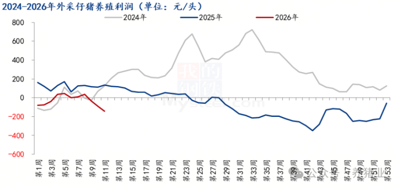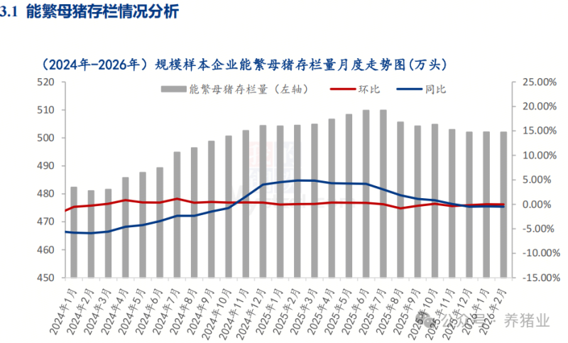 钢联数据显示,截至2月份,123家规模养殖企业能繁母猪存栏量为 502.04 万头,环比微降 0.01%,同比跌幅 0.48%。85 家中小散样本场中,2 月份能繁母猪存栏量为 16.686 万头,环比下调 0.11%,同比跌幅 2.12%。养殖端担心后续行情回暖,不愿轻易淘汰能繁母猪,导致去化进程受阻。即便当前加快去化,随着psy和msy的稳步提升,生猪供给总量仍将保持充裕,对价格上涨形成一定压制。
