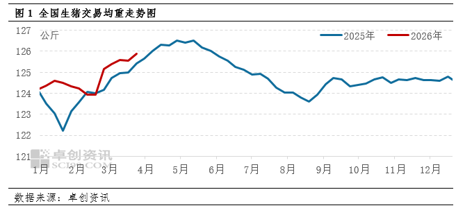 3月份国内生猪交易均重先涨后降。据卓创资讯统计,本月全国生猪交易均重为125.61公斤,环比上涨1.05%,同比涨0.72%。前两周养殖端出栏积极性较高,2月积压的大猪货源集中出栏,供应端集中增量,但终端需求处于春节后消费清淡期,供应过剩逐步加剧,猪源被动压栏导致交易均重小涨。中旬过后随着猪价跌至低位,部分屠企加大低价分割入库,市场消化速度加快,加之部分养殖端小幅度减重出栏,且北方屠企加大对大猪扣罚,减少大猪收购,多项因素推动生猪交易均重下滑,但因大猪消化难度仍存,体重降幅较小,两周仅累计下滑0.29公斤。