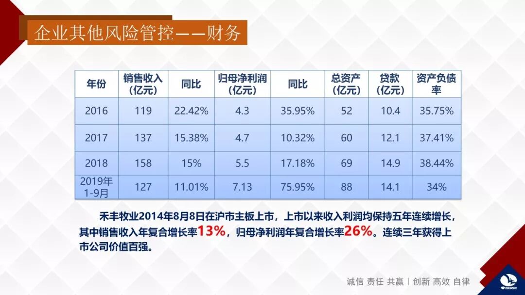 总体来说很多人认为禾丰胆子太小了,这是我们的财务数字,资产负债率是34%,我们创业到现在几乎没突破过40%,这在民营企业里太少了。因为我们觉得危机四伏。土地不是我们的、宏观政策我们不能控制,而银行的资金供给不稳定随时在调整,我们必须对未来风险做充分的准备,所以禾丰是一个更像西方公司的量入为出的理性企业。禾丰从2008年开始所有的贷款就都是信用贷款,而第一笔信用贷款来自于世界最保守的银行荷兰合作银行,它对中国6家农业企业,包括两家跨国大集团进行分析以后,只有禾丰的指标是合格的,我们没想到。荷兰合作银行工作人员说:“你们禾丰的EBIT指标决定你们可以贷这么多钱,而你们贷得太少了。”贷款的最后一个程序是荷兰合作银行行长要来找我谈一个小时,他要用一个银行家的眼光来识别我,考量我是不是一位优秀的、值得信任的企业家。我问中国区行长:“都有谁参加?谈什么?”他告诉我说:“只有你们两个人,不知道谈什么。”一个小时谈完以后,我就已经知道了禾丰一定可以得到这笔贷款。禾丰上市以来销售收入年复合增长率13%,归母净利润年复合增长率26%,这是中国所有上市农牧企业里“唯二”的,只有两家做得到,一家是南方的企业,一家是禾丰,上市初期那家企业从资本市场获得的资金是我们的十倍左右,现在我们各项指标还略低对方,但是在同一个竞争水平上。在东北地区做到这个程度很不容易,因此我自信东北也有好企业,东北也有理性而又勇敢的企业家。这些发展指标也说明了禾丰既是一个积极进取的,同时又是一个非常注意控制风险、稳健经营的企业。