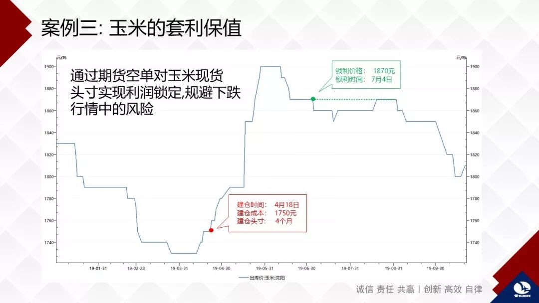 第三通过期货空单对玉米现货头寸实现利润锁定,规避下跌行情中的风险。通过这次操作实现了120元/吨的利润。因为我们玉米用量很大,占禾丰总体原料用量的60%,玉米采购能做得好对企业更重要。